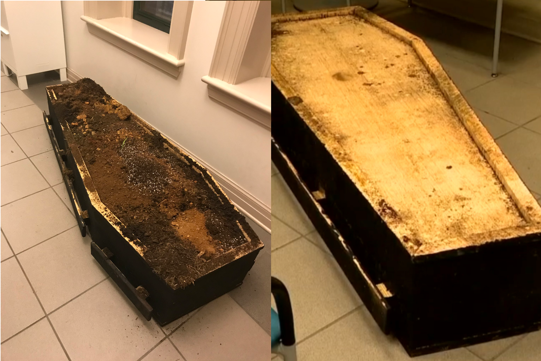Like many of the thousands of people who retweeted the post noted, a box that size full of soil would have weighed hundreds of pounds more than an empty box with dirt on top. The police moved the coffin indoors from where protesters placed it before taking the photo, giving them ample opportunity to note the weight.