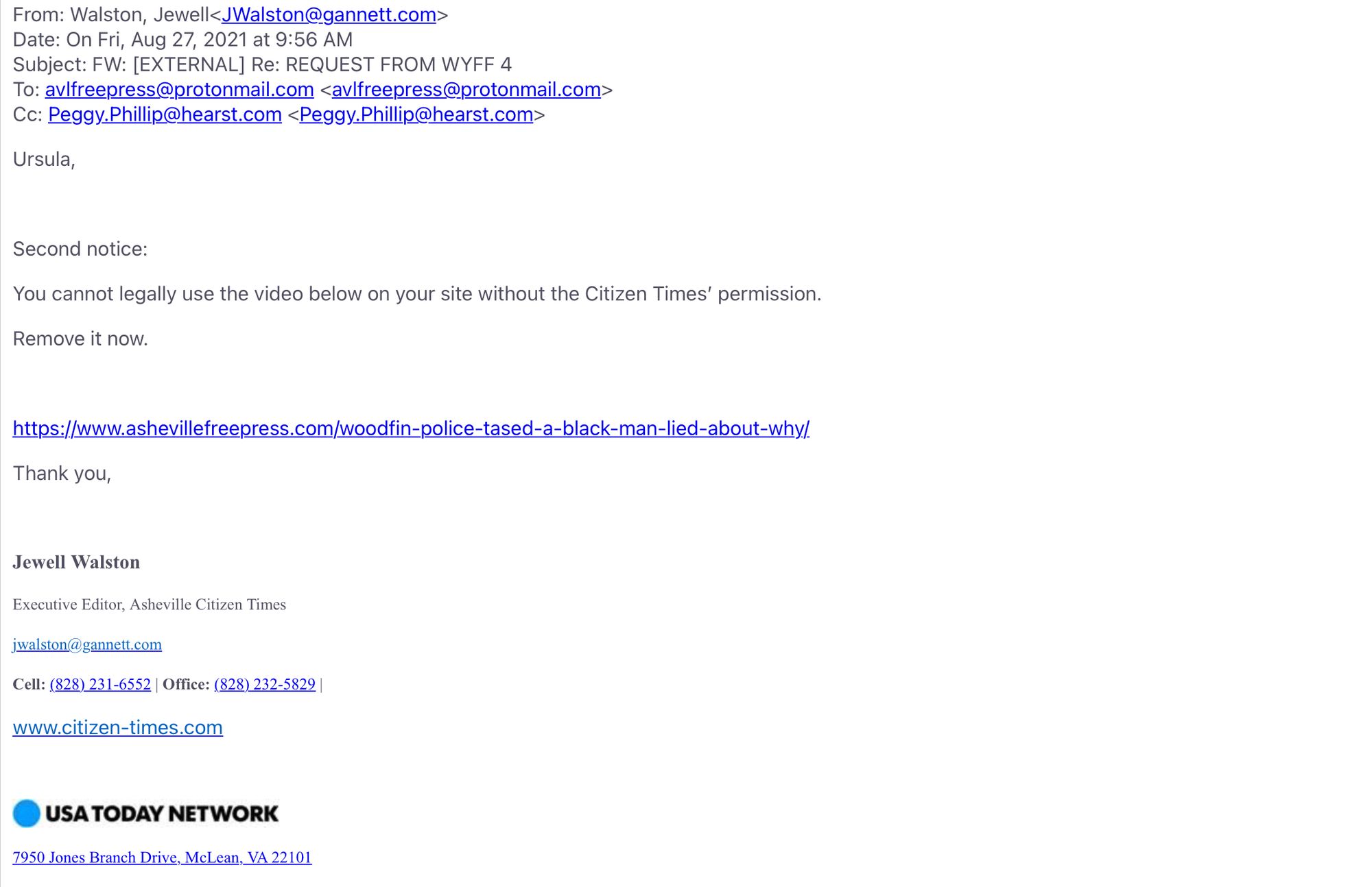 The Asheville Citizen Times' Executive Editor, Jewell Walston, sent an email to The Asheville Free Press this morning demanding that we remove the link to their video of a Black man, Jonathan Barker, being tased by Woodfin police.