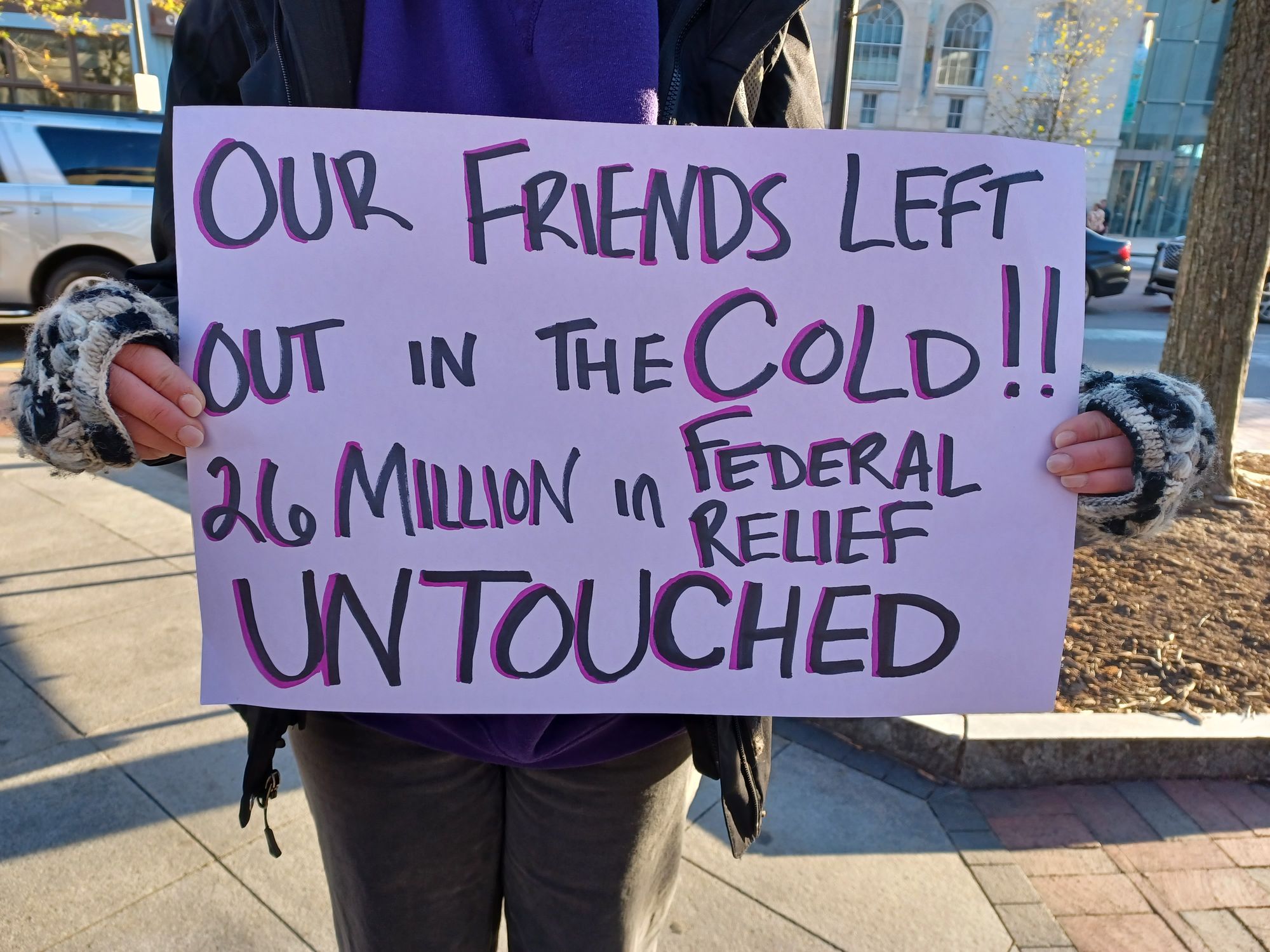 "Our unhoused friends have been weathering severe cold and wind-chill over the past week, with temperatures dropping into the 20s at night," the organizers said in a statement. "We demand that relief funding be used to provide safe and warm spaces to sleep for the unhoused community."
